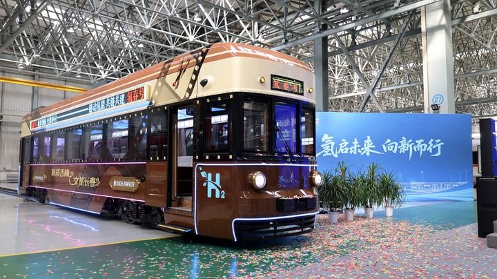 2025年10月16日,中国中车发布氢能文旅列车“氢春号”,图为现场展出的全国首列氢能文旅列车“氢春号”。新华社记者 唐铭泽 摄