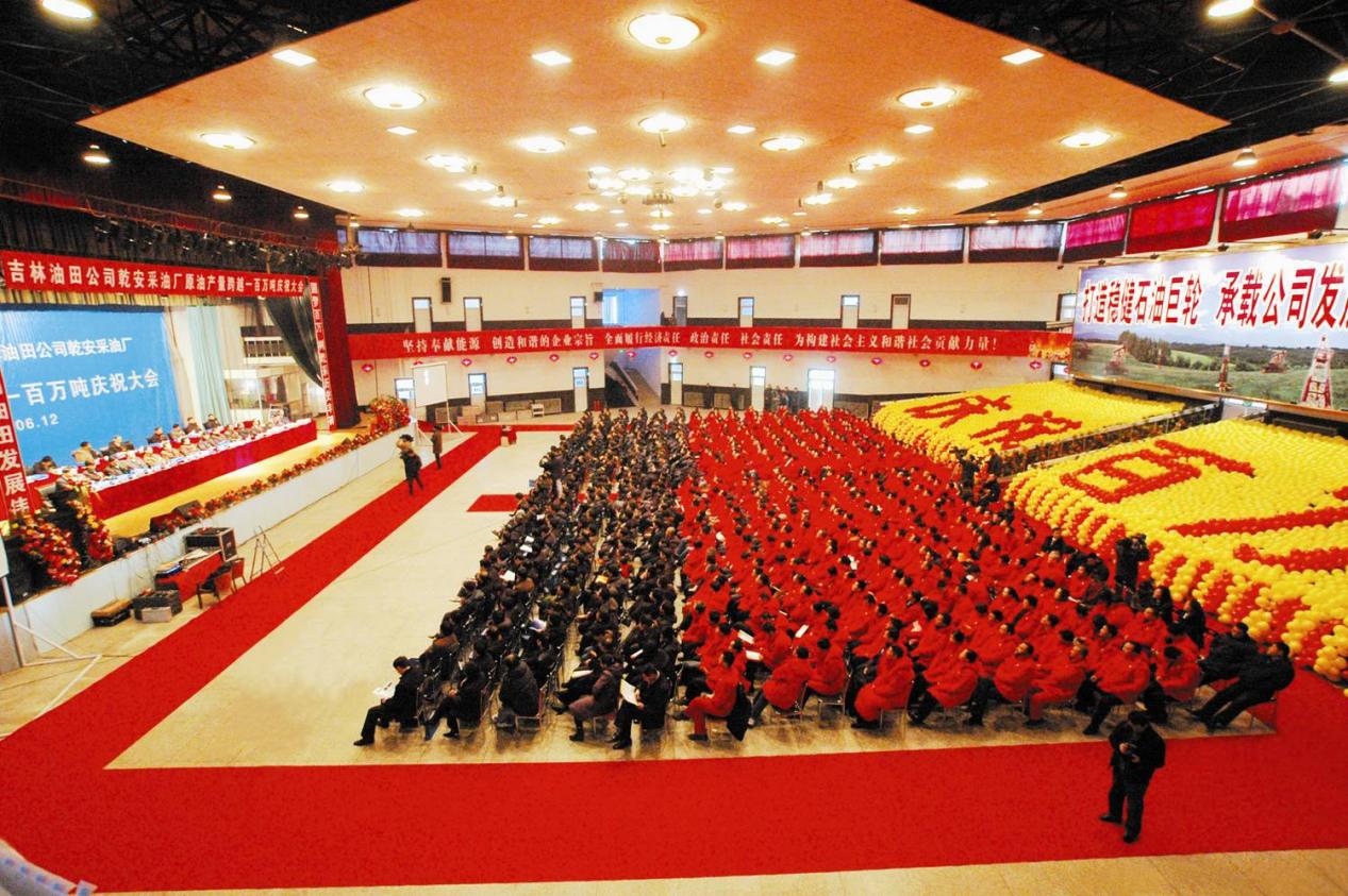 2006年底,吉林油田公司乾安采油厂原油产量跨越100万吨庆祝大会现场。