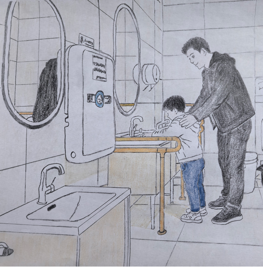 旅客在长春站卫生间洗手。(绘画:林玥彤)
